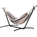 Concedetevi una pausa di relax con l'amaca Galapagos in tessuto di Zendea, con struttura di sostegno in acciaio. L'amaca portatile può essere posizionata in qualsiasi luogo all'aria aperta, che si tratti dell’ombra di un albero frondoso vicino al tuo giardino o nel cortile. Rilassati e stenditi a leggere un libro oppure ad osservare le nuvole in cielo. L’amaca è il simbolo per antonomasia dell’estate, nonostante sia una fantastica idea per tutto l’anno. Questa amaca portatile è facile da utilizzare, offre una piacevole evasione e un posto divertente in cui riposarsi. Può ospitare fino a 2 persone. Quest'amaca doppia e durevole è stata concepita per sostenere 2 persone e un peso fino a 181,4 kg. È adatta sia come seduta oppure come giaciglio su cui stenderti e guardare il mondo attorno a te, da solo o in compagnia. Struttura di sostegno salvaspazio in acciaio. L’amaca è dotata di una base di sostegno in acciaio, che la rende estremamente robusta e stabile grazie al suo design 2,74 m salvaspazio. Il sostegno mantiene l'amaca in tessuto ferma al suo posto, mentre la base ampia permette di posizionarla in maniera sicura. Materiale in tessuto. Il tessuto di alta qualità dell’amaca consiste di 53% poliestere, 33% cotone, 11% rayon e 3% nylon e offre sia comodità che durevolezza. La superficie dell’amaca misura 238,76 x 160 cm (330 cm da un’estremità all’altra). Tutte le parti incluse. L’amaca in tessuto Zendea con struttura di sostegno include anche una comoda borsa per il trasporto. Metti l'amaca nella borsa e portala con te alla spiaggia, in campeggio o dagli amici. Tutte le parti sono incluse e permettono un montaggio facile e veloce: non servono ulteriori attrezzi.