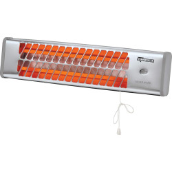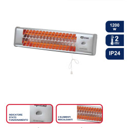 Stufa al quarzo da parete per interno ed esterno, con due livelli di potenza selezionabili tramite interruttore a tirante (600/1200W).