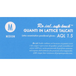 Guanti monouso in lattice talcati Ro.ial safe touch. Guanti monouso ambidestri, finemente talcati e di facile calzata con bordino all'estremità. Taglia M, 4 confezioni da 100 pezzi.