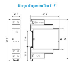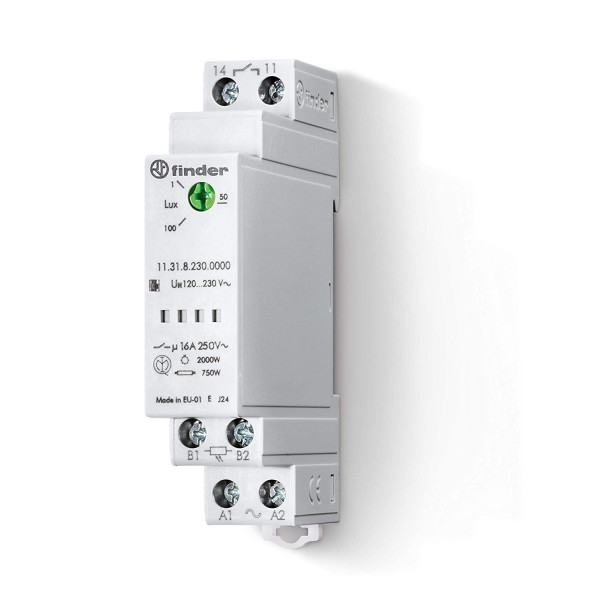 Relè crepuscolare Tipo 11.31 per accensione lampade in funzione del livello di luminosità ambiente, fornito con elemento fotosensibile separato. Dotato di 1 contatto NO 16 A, regolazione della sensibilità da 1 a 100 lux, un modulo, larghezza 17.5 mm. Basso consumo in stand-by, versione disponibile dell’alimentazione 24 V DC/AC. Caratteristiche: Primi 3 cicli di funzionamento del relè senza ritardo all’accensione ed allo spegnimento, al fine di facilitare le operazioni di regolazione da parte dell’installatore; Indicatori LED; Separazione SELV tra circuito di alimentazione e contatti; Doppio isolamento tra alimentazione e fotosensore; Montaggio su barra 35 mm (EN 60715); Contatti senza Cadmio; Elemento fotosensore senza Cadmio (IC photo diode).