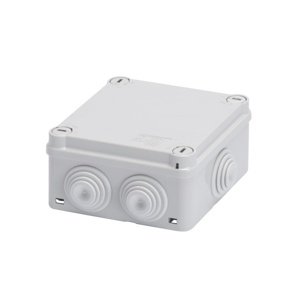 Cassetta di derivazione con coperchio basso e viti da 1/4 di giro. IP55, dimensioni interne 150x110x70mm, pareti con passacavi. Colore Grigio RAL7035.