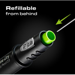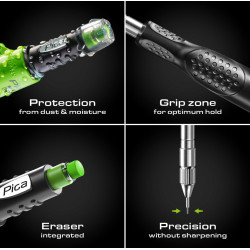 Precisione senza affilatura: la matita con avanzamento meccanico con un diametro della mina di soli 0,9 mm è ideale per una marcatura fine e precisa, il meccanismo a pressione viene utilizzato per l'avanzamento automatico della mina e ha un potere di tenuta di lunga durata. Il pratico fodero della matita, realizzato in plastica robusta e dotato di una clip extra resistente, che consente un rapido utilizzo con una sola mano.