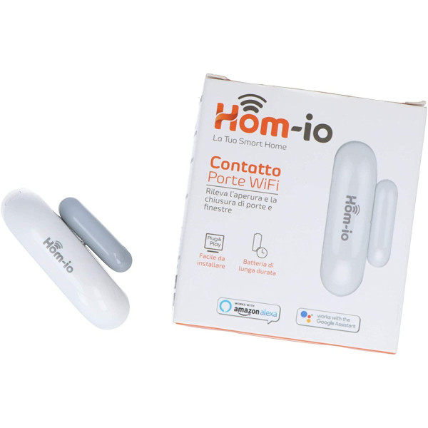 Sensore porta finestra intelligente rileva l'apertura o la chiusura di una finestra, porta, cancello o tenda. Compatibile con gli accessori domotica Hom-io. Montaggio con viti o biadesivo. Batteria a lunga durata.